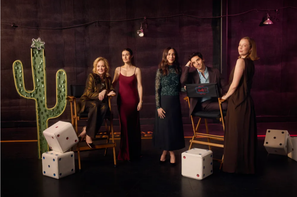 Trong một buổi sáng sớm tháng Giêng ấm áp tại Las Vegas, toàn bộ ê-kíp siêu phẩm “Hacks” — từ các ngôi sao, đội ngũ hậu trường đến các nhà sản xuất — đang tất bật tụ họp quanh Kyu, một nhà hàng sushi tọa lạc tại khách sạn Fontainebleau. Hôm nay dự kiến sẽ là một ngày ghi hình vô cùng bận rộn với ba bối cảnh quay rải rác khắp thành phố.